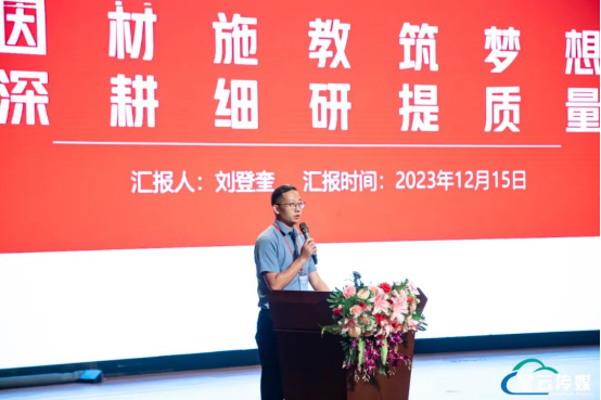 学生处刘登奎处长发言 学生处刘登奎处长就新形势下德育工作开展路径及实施策略,做了"因材施教筑梦想,深耕细研提质量"主题发言,就我校2023年度生源基本情况、现状及挑战、应对策略与保障措施做出详尽分享。