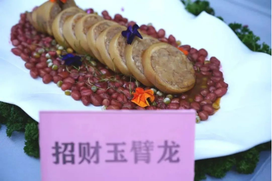 历届的师兄们承担起了指导师弟们制作菜品的责任,林壤明大师、叶露大师也对菜品进行了点评。在这个过程中,他们相互分享自己的经验和心得,讨论如何提高菜品的质量、如何创新菜式、如何应对繁忙的工作节奏。这种分享不仅仅是技术的交流,更是情感的沟通。他们一起成长,一起进步,有效传承了粤菜文化。 菜品展示 招财玉臂龙